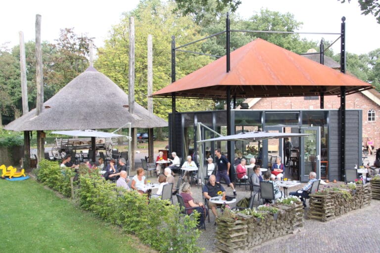 Het Theehuis bevindt zich op de plaats waar vroeger de hooiberg stond en is opnieuw opgebouwd met veel glas en een Cortenstalen kap.
